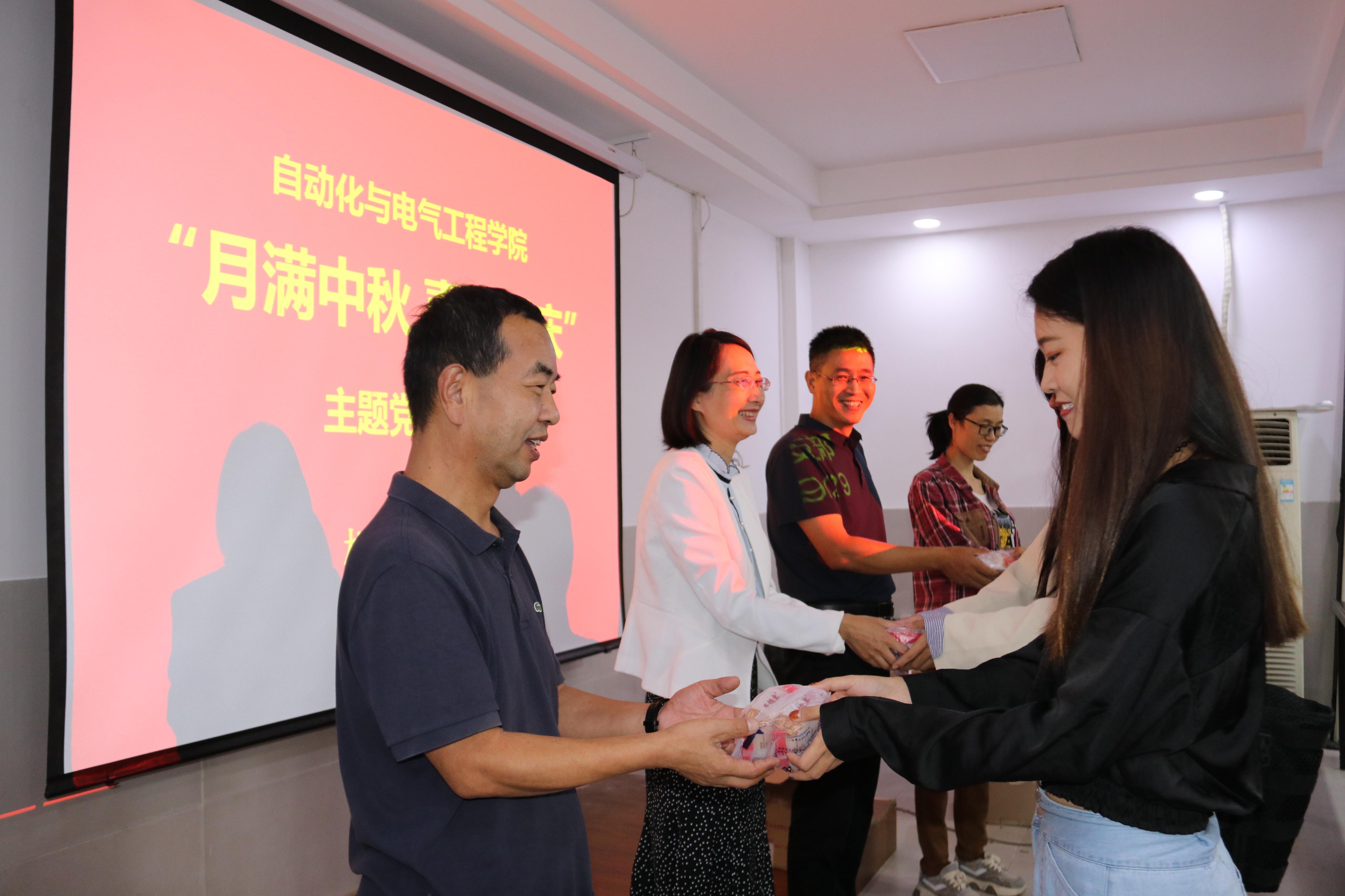 在中秋节和国庆节来临之际,为了让同学们感受到学校和学院领导和老师们的关心和祝福,9月29日下午,学院机关党支部举办“月满中秋 喜迎国庆”主题党日活动,支部党员为新生们分发中秋礼物。参加此次活动的老师有学院党委书记夏卫东,学院副书记、副院长陈春锋,机关党支部党员王英华、刘宁宁。